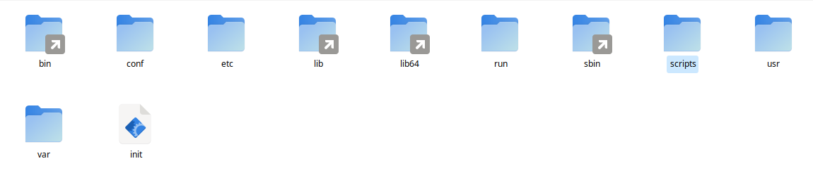 Sistemin açılması için vmlinuz, initrd.img ve grub.cfg dosyalarının olması yeterlidir. initrd.img sistemin açılma sürecini yürüten bir kernel yardımcı ön sistemidir. initrd.img açıldığında aşğıdaki gibi bir dizin yapısı olur. Bu dizinler içindeki script dizini çok önemlidir. Bu dizin içindeki scriptler belirli bir sırayla çalışarak sistemin açılması sağlanır.
