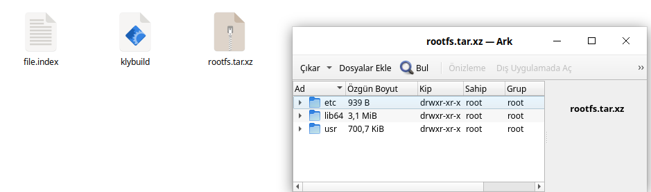 # rootfs.tar.xz, file.index ve klybuild dosyaları tar.gz dosyası olarak hazırlanıyor.