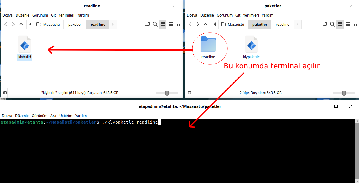 Burada readline paketini örnek alarak klypaketle dosyasının ve klybuild dosyasının nasıl hazırlandığı anlatıldı. Diğer paketler için sadece hazırlanacak pakete uygun şekilde klybuild dosyası hazırlayacağız. klypaketle dosyamızda değişiklik yapmayacağız. Artık klypaketle dosyası paketimizi oluşturan script klybuild ise hazırlanacak paketin bilgilerini bulunduran script dosyasıdır.