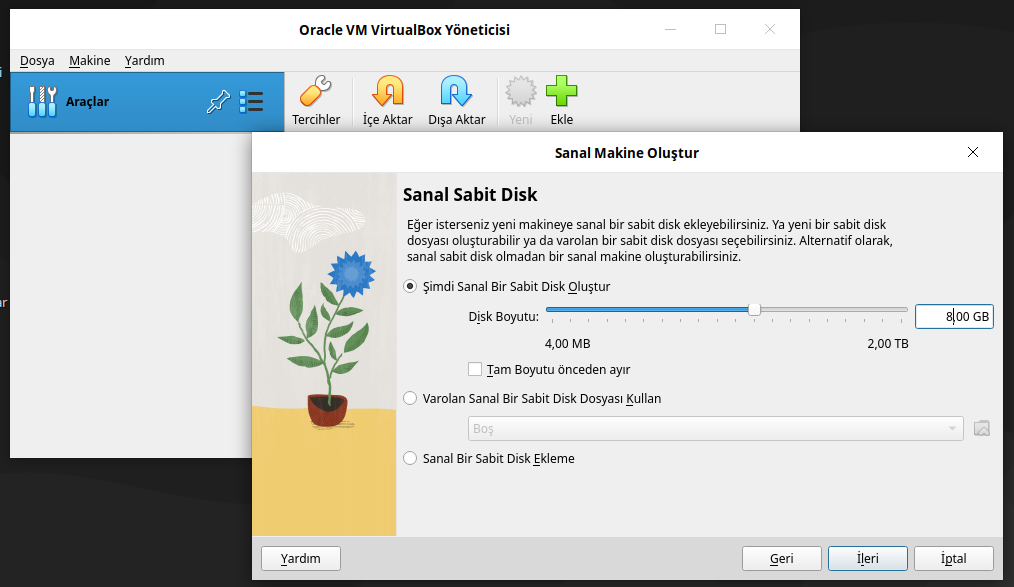 Disk boyutu belirlenir. 8GB bu sistem için yeterli. İleri seçeneği seçilir.